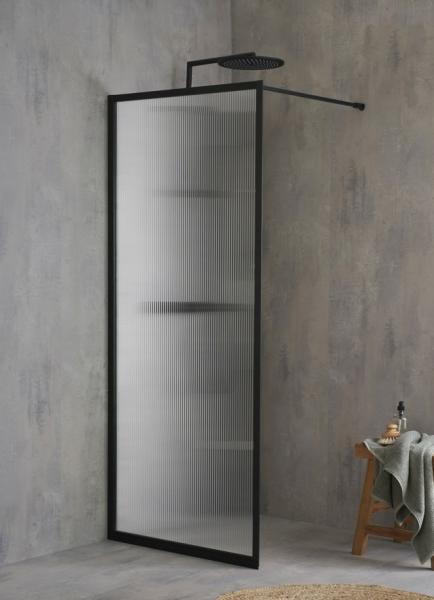 Cassøe fast brusevæg - Mat sort ramme/Riftlet glas - 95 cm Stilren brusevæg med mat sort ramme og riflet glas. Du får her en smuk afgrænsning af dit bruseområde, uden at miste lys. Det riflede, eller rillede, glas giver privatliv, uden at glasset er matteret. Den faste brusevæg er indrammet af sorte profiler, og støttearmen er ligeså sort. Fuldend looket med et brusesystem i mat sort for et minimalistisk badeværelse i New Yorker-stil. Specifikationer: