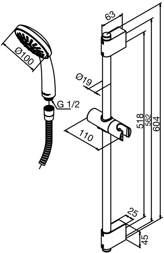 Damixa Brusersæt Fair Jet 1-funktion m/stang Brusesæt indeholder stang, glider(holder), håndbruser og 1500 mm plast slange.