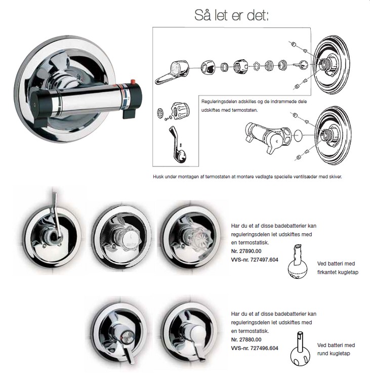 Damixa Termostatbatteri komplet termostatsæt model 27890 til Damixa indbygningsbatteri (med firkantet kugletap). Specifikationer:
