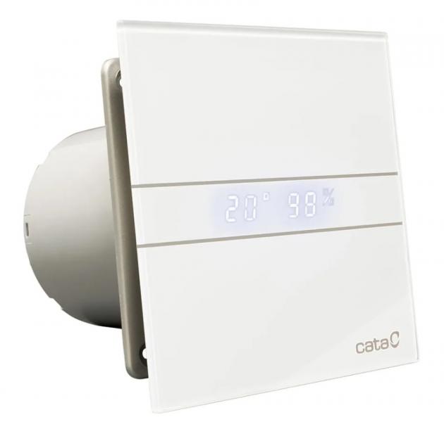 Cata Ventilator E-100 GTH med fugtstyring (hygrostat) og timer Rigtig flot ventilator med glasfront, der nemt kan tages af og rengøres. E-100 er en ventilator med indbygget hygrostat og timer. Timerfunktionen kan indstilles til at køre fra 3 til 15 minutter. Hygrostaten kan indstilles til at fjerne fugt fra 40% til 95%. Både temperaturen og luftfugtigheden kan ses på displayet. Tekniske specifikationer: