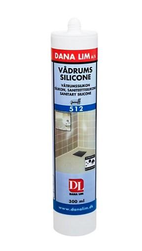 Dana Lim vådrumssilicone 512 transparent - 300ml Neutral højelastisk fugemasse der hærder ved reaktion med luftens fugtighed, og danner en elastisk fuge der kan optage bevægelser på op til 25%. Indeholder fungicid (svampedræbende middel), der reducerer risikoen for bakterievækst, svamp og mug på fugerne, og tillige har stor bestandighed mod almindeligt anvendte rengøringsmidler. Anvendes alle steder med høj fugtighed; f.eks. tætning i badeværelser, brusekabiner, mellem sanitære installationer, ved vinduer med kondensvand m.m.