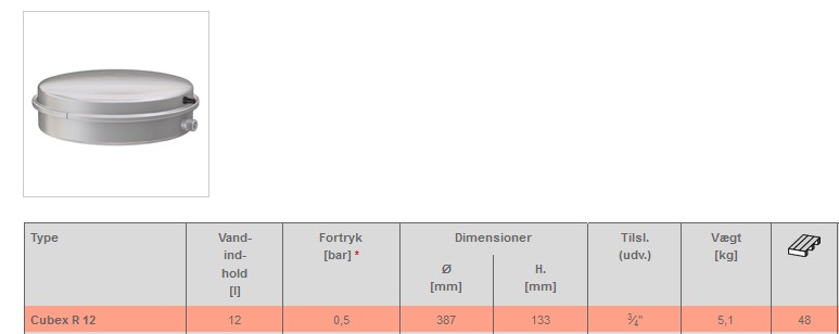 Trykekspansionsbeholder i flad udførelse, med 0,5 bar fortryk og max. arbejdstryk på 3 bar . Til opvarmnings- og kølevandsanlæg, er bl.a. egnet til indbygning kedeluniter. |