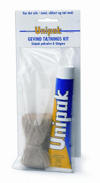 Gør det selv pakke til samling af gevindrør og fittings. UNIPAK paksalve er en grå, højviskos paksalve bestående af en forsæbning iblandet naturligt forekommende mineraler og viskositetsregulerende olier og vand. Samtlige indholdsstoffer er tilladt som tilsætningsstoffer til fødevarer og lign. |