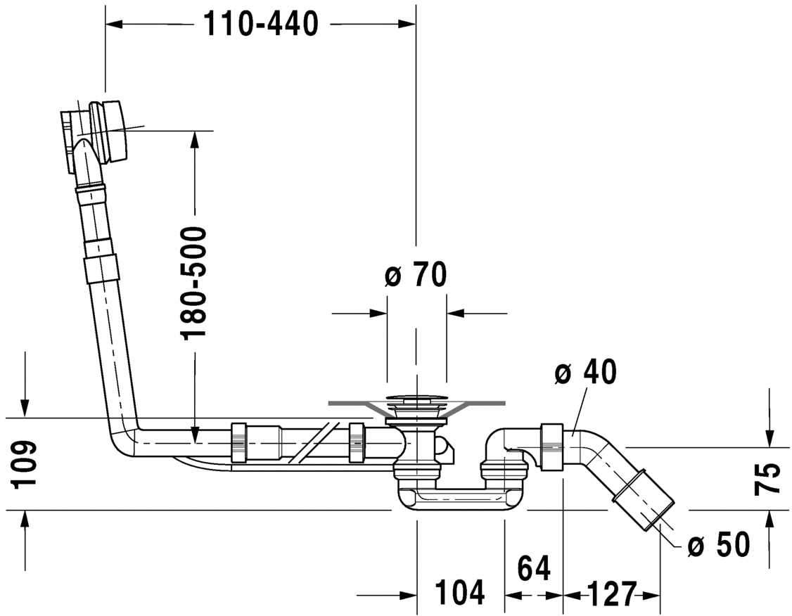 Duravit Paiova Af- og overløbssæt Quadroval krom til badekar med afløb i midten. Afløbshoved 52 mm. Kabellængde 850 mm. |