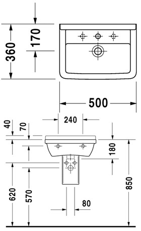 Duravit Starck 3 50 håndvask t/væg Duravits Starck 3-serien tager udgangspunkt i den rektangulære form og enkle kanter. Denne Duravit håndvask er pladsbesparende, da den rektangulære form er kombineret med en dybde på 36 cm. Håndvasken har bagkant.