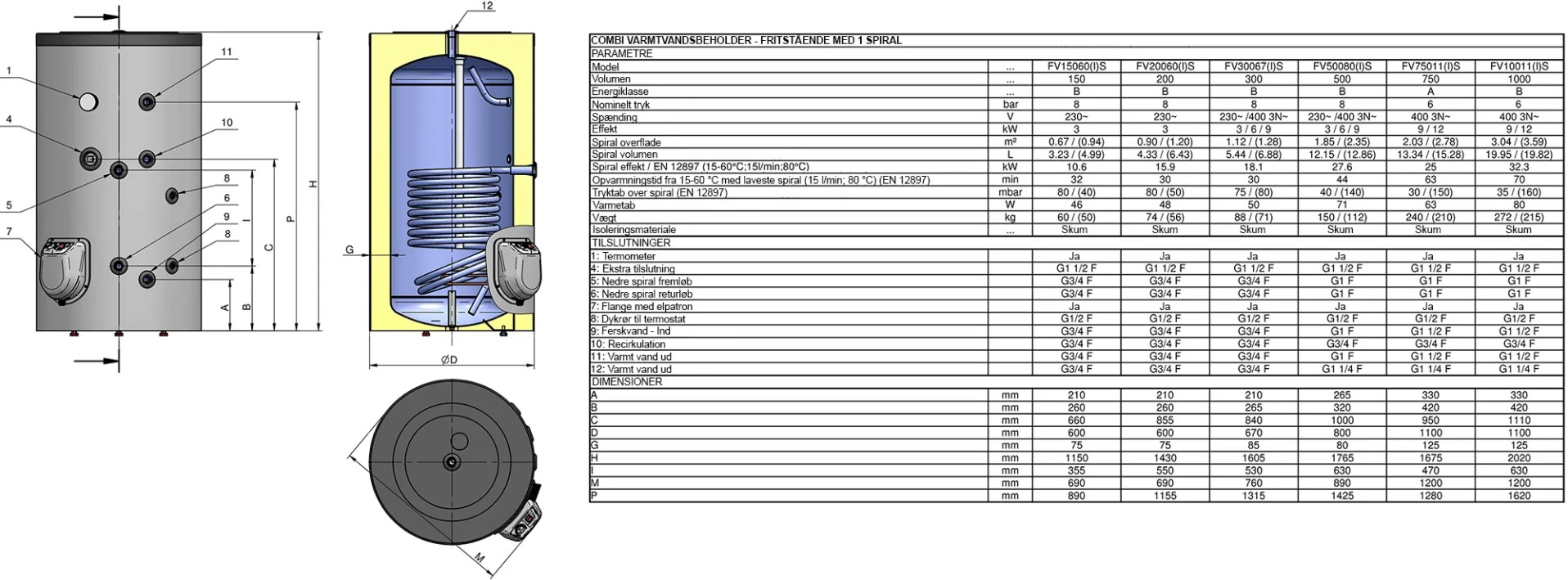 Combi varmtvandsbeholder 150 L - Fritstående med 1 spiral Fritstående combi varmtvandsbeholder med 1 spiral og el-patron. Effektiv fritstående combi varmtvandsbeholder / vandvarmer fra ELDOMINVEST Hurtig og nem installation. Solid beholder, med 1 spiral. Der kan tilsluttes pillefyr, varmepumpe, solvarme, fjernvarme eller en helt anden varmekilde til spiralen i bunden. Mere end 85mm tyk isolering i polyurethanskum sikrer minimalt varmetab og god energibesparelse. Den gode isolering har givet beholderen energiklasse B. Beholderen er emaljeret og rustbeskyttet for at sikre lang holdbarhed. Vi anbefaler tilkøb af sikkerhedsamatur - 8 bar til alle varmtvandsbeholdere.