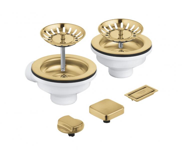 Grohe afløbssæt til køkkenvask m/skylleskål inkl. drejeknap - Børstet cool sunrise Sæt kronen på værket og skift dit afløbssæt til din køkkenvask, så det matcher dit Grohe køkkenarmatur i børstet cool sunrise. Specifikationer: