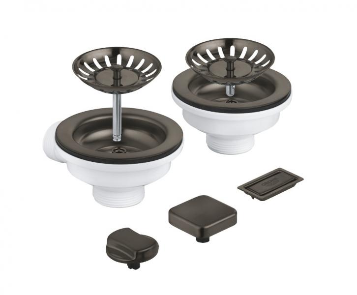 Grohe afløbssæt til køkkenvask m/skylleskål inkl. drejeknap - Børstet hard graphite Sæt kronen på værket og skift dit afløbssæt til din køkkenvask, så det matcher dit Grohe køkkenarmatur i børstet hard graphite. Specifikationer: