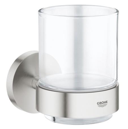 Grohe Essentials glas inkl. holder - Steel Hold dit badeværelse ryddeligt med væghængt badeværelsestilbehør. Dette glas inkl. holder fra Grohes Essentials-serie er et stilsikkert valg, som du kan matche med toiletbørste, håndklædeholder, kroge mv. Designet er enkelt og funktionelt, men er med til at skabe en klar moderne og elegant stil på dit baderum. Specifikationer: