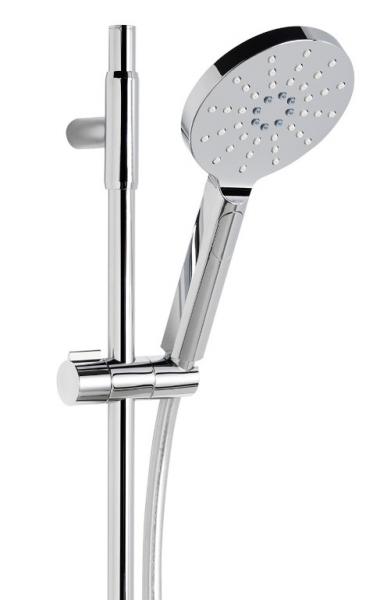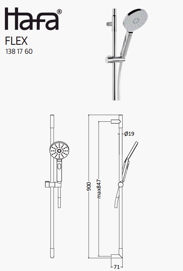 Hafa Flex brusesæt - Krom Funktionel brusesæt i krom med brusestang i metal og bruserslange med AntiTwist. Ø 120 mm. Brusestang med justerbare vægbeslag 350-847 mm. Brusesætet indeholder sæbeskål.