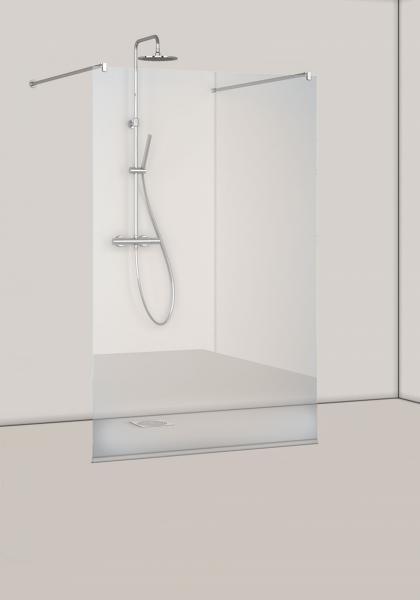 Monteringsvenlig fast lige brusevæg, som monteres midt på væggen med to stænger. Stangen er 1200 mm og kan afkortes til en valgfri længde. 8 mm hærdet sikkerhedsglas. Højde 2000 mm. Ved køb af bredden 1270 til montering i et hjørne, skal du købe en ekstra vægprofil, 1450366