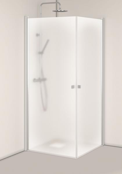 Brusehjørne: Monteringsvenligt brusehjørne med limbare profiler i aluminium. Nemt at installere og justere for én person, InstaQuick™. Vendbare døre. 6 mm hærdet sikkerhedsglas. 8 mm frihøjde fra gulvet. Højde 2000 mm. Kan monteres med udvendige 12-mm-rør, cc 35 mm. 18 mm glideskinne medfølger.