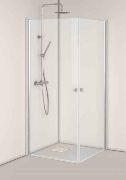 Brusehjørne: Monteringsvenligt brusehjørne med limbare profiler i aluminium. Nemt at installere og justere for én person, InstaQuick™. Vendbare døre. 6 mm hærdet sikkerhedsglas. 8 mm frihøjde fra gulvet. Højde 2000 mm. Kan monteres med udvendige 12-mm-rør, cc 35 mm. 18 mm glideskinne medfølger.
