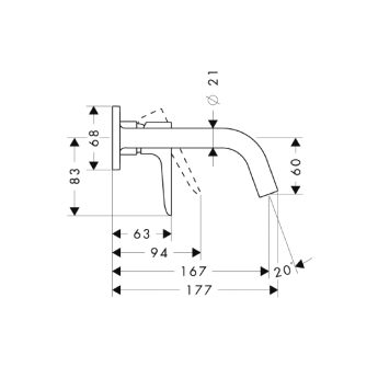 1-grebs håndvaskarmatur til vægmontering -Med rosetter -167 mm. tud -Keramisk kartusche -Vandsparer til max 7 l/min. -Kombineres med indbygningsdel 727598104 og lækagesikringer 96362000