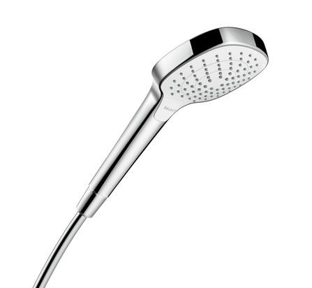 Croma Select E Vario håndbruseren i det smarte soft-cube design tilbyder 3 forskellige stråletyper; Rain, IntenseRain og Turbo Rain. Stråletyperne vælges enkelt og intuitivt med den praktiske Select-knap. Brusehovedet er på hele 110 mm og er udstyret med Hansgrohes QuickClean-teknologi, der gør det let at gnide kalkrester af de fleksible silikonedyser med en finger.