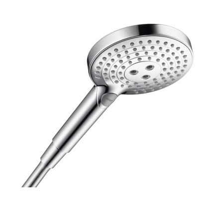 Hansgrohe Raindance Select S 120 håndbruser - 3 Spray m/ECOsmart - Krom Brusefornøjelse for enhver smag. Med Hansgrohes Select-funktion er det utroligt enkelt at vælge mellem håndbruserens tre stråletyper. Tryk blot på Select-knappen på bruserens håndtag for at skifte til RainAir, Rain og Whirl-strålen, og så er du på et kort sekund klar til at nyde bløde brusedråber, effektivt regnbrus eller massagestrålen. Vandet strømmer ud af et rundt brusehoved i et harmonisk og afrundet, men også klassisk design, der bringer elegance ind i både det tidløse og det moderne badeværelse. EcoSmart-version med et vandforbrug på bare 9 l/min. Med QuickClean antikalk-funktion.