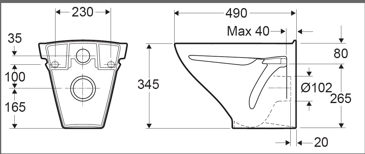 Man kan fint bruge dette væghængte toilet på en eksisterende indbygningscisterne. Man skal blot sikre, at boltafstanden (se måltegning) er den samme som på den skål der er monteret i forvejen. Trykknapperne, eller trykpladen, skal ikke skiftes, den følger indbygningscisternen. Skal du også have en ny indbygningscisterne, så kan du se relaterede varer eller på vores mange toiletpakker. |