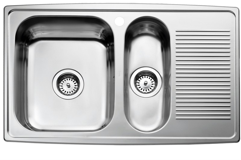 Køkkenvask med stor vask til venstre og en lille kumme med afløbsbakke.