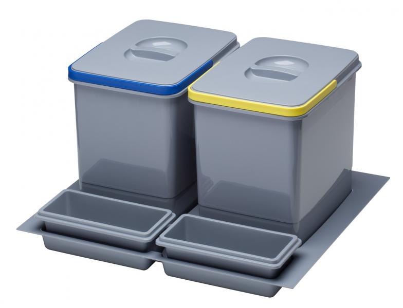Intra Juvel Practiko 600-2 affaldssystem m/2 spande og opbevaringsbakke Smart affaldssystem med 2 spande og smart opbevaring foran spandene. Hver spand har farvede håndtag i forskellige farver, så det er nemt at identificere den rette spand til det rette affald. Ydermere har begge spande låg. Dette affaldssystem fra Intra Juvel er beregnet til montering i skuffe. Specifikationer:
