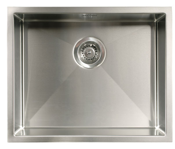 Intra Quadra 500 køkkenvask. Firkantet køkkenvask, enkelt kumme, til underlimning. Leveres med strainer og vandlås.