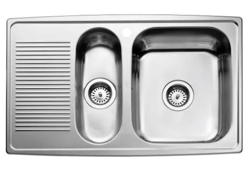 Køkkenvask med stor vask til højre og en lille kumme med afløbsbakke.