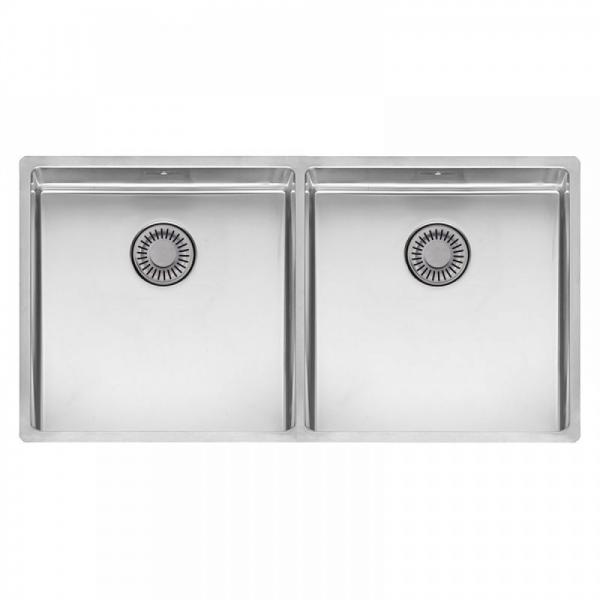 Rustfri stålvask, uden hanehul, med to kummer i moderne firkantet design med comfor afløb.