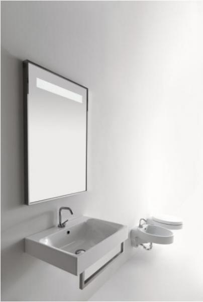 Outletvare til nedsat pris - Kun 1 stk. tilbage til outletpris. Hvid porcelænsvask i firkantet design med hanehul og overløb. Vasken kan placeres på bordpladen eller hænges på væggen.
