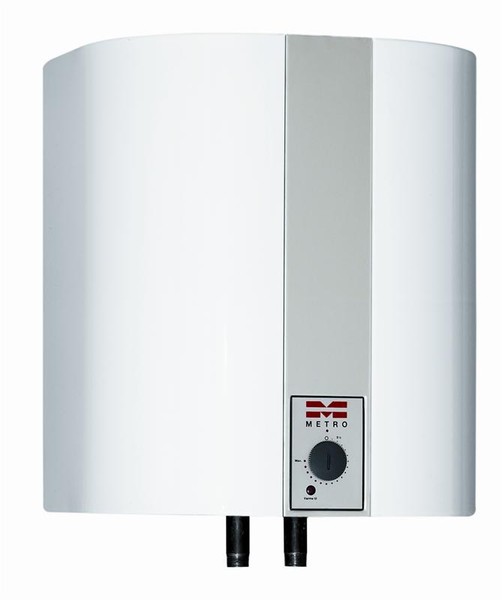 Metro vandvarmer model 30 til el - rør ned. Trykfast konstruktion - 10 bar til lodret montering på væg eller gulvstativ med rørforbindelserne ned ad.Vandvarmerne monteres som trykbeholder med sikkerhedsventil til flere tappesteder med normalt tryk blandingsbatterier. Vandvarmerne er specielt beregnet til opvarmning af brugsvand til køkken, håndvask og brusebade i énfamilieboligen.Brugsvandet opvarmes af et keramisk elvarmelegeme, der er monteret i et emaljeret flangerør. Herved reduceres kalkopbygning på varmelegemet, og risikoen for gennemtæring af beholderen reduceres.