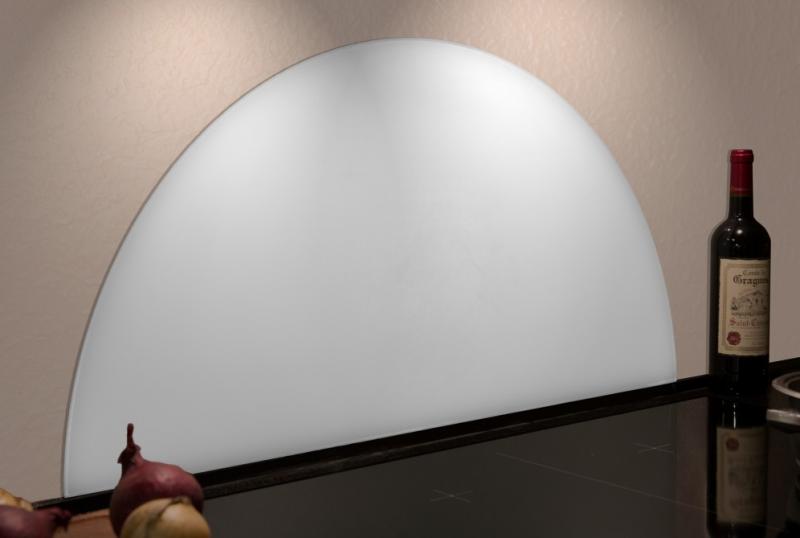 Halvcirkel stænkplade til køkken - 80 x 40 cm - Hvid glas Denne stænkplade er en praktisk tilføjelse til køkkenet. På trods af det praktiske element, så har pladen et simpelt og elegant udtryk. Stænkpladen har en cirkelform, og den har til formål at beskytte væggen fra stænk ved kogeplade eller køkkenvask. Pladen er af hvidt hærdet glas, hvilket gør den nem at tørre over med en fugtig klud efter madlavning eller opvask. Monteringen og vedligeholdelsen er ligeledes let, da pladen blot limes på væggen.