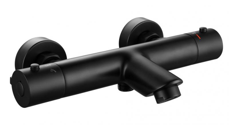 Nortiq Seram badekararmatur - Mat sort Nortiq Seram badekarsarmatur monteres på væggen, hvor den pryder badeværelset med sit slanke og moderne design. Kararmaturet har en mat sort finish, der giver et stilrent udtryk, som passer til ethvert badekar. Armaturet har to udgange – en kartud og en udgang til montering af håndbruser. Armaturet betjenes ved to grebs-styring, hvor højre side regulerer vandets temperatur og venstre side regulerer vandtrykket. Når grebet drejes op ad, tændes håndbruseren, og når det drejes ned ad, løber vandet ud af tuden og ned i badekaret. Badekarsarmaturet er udstyret med en sikkerhedsspærre ved 38 grader, der forhindrer skoldning.