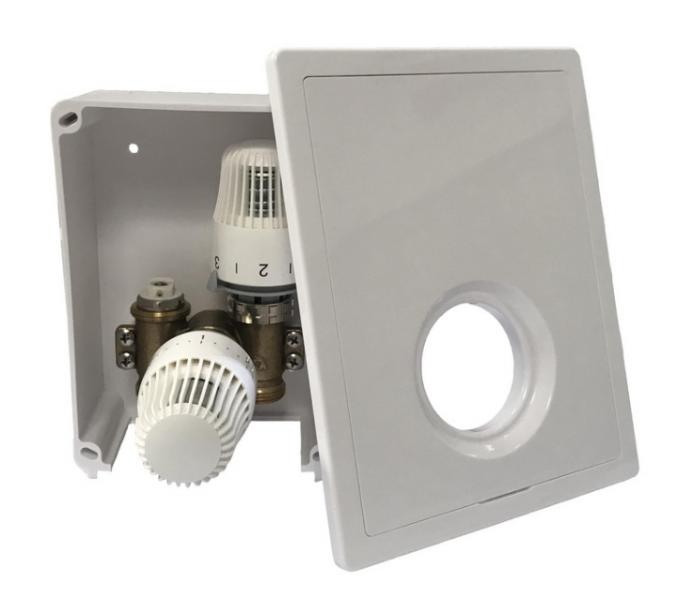 Pettinaroli multiboks til gulvvarmeregulering af én kreds. Multiboksen består af en indbygningsboks med beslag for nem indmuring. I boksen er indbygget en ¾” ventil, luftskrue samt to termostathoveder til regulering af vandtemperaturen samt rumtemperaturen. Multiboksen er ideel til renovering, men kan også med fordel bruges til nybyggeri. |