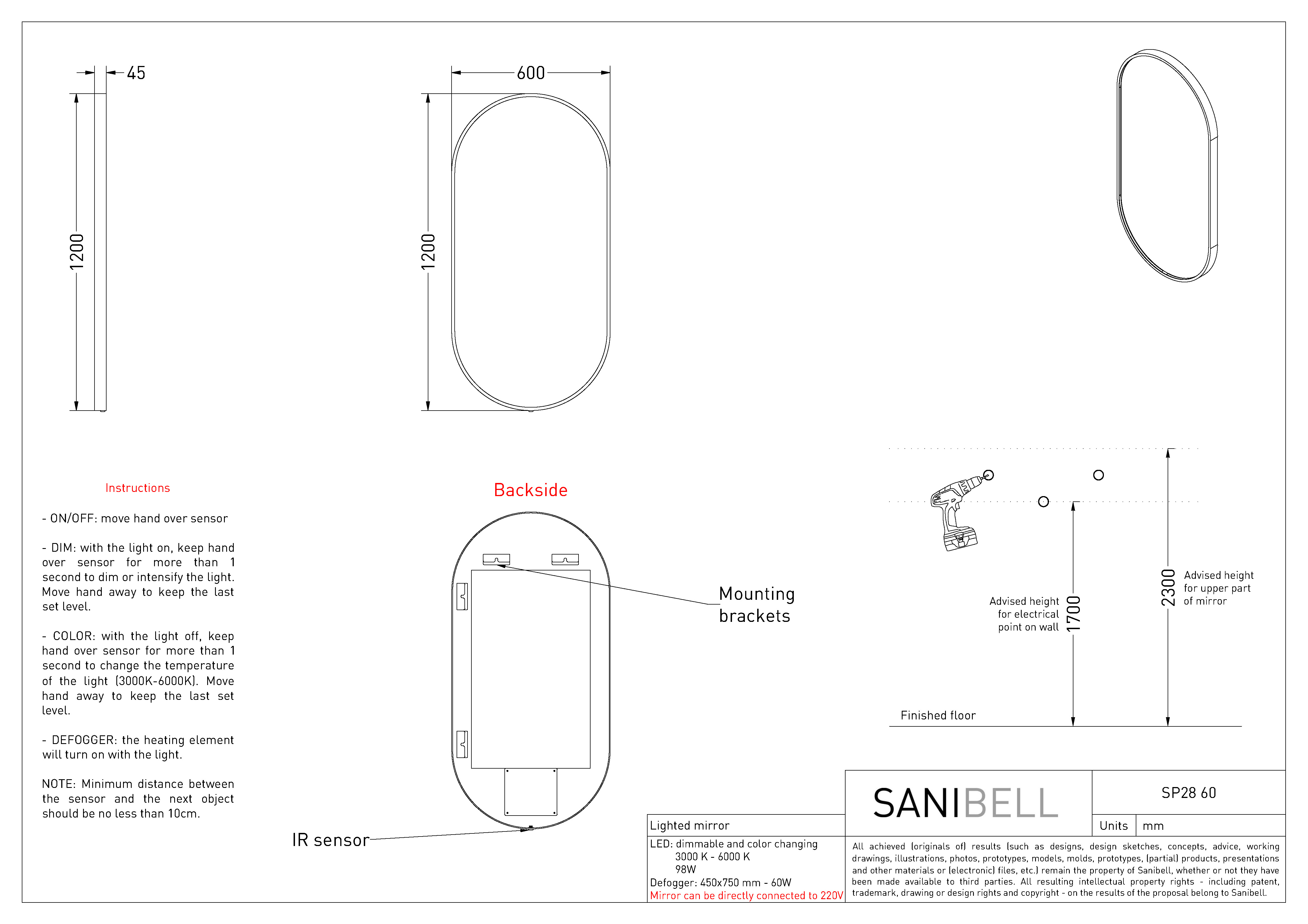 Sanibell Ink SP28 ovalt spejl m/lys, varme og sensor 60 x 120 cm - Børstet kobber Charmerende ovalt spejl fra Sanibell Ink. Dette badeværelsesspejl har LED-lys indbygget i rammen, så du opnår et godt, jævnt lys. Selve lysets farvetemperatur kan ændres, så det passer placering, klokkeslet eller behov. Spejlet har desuden indbygget varme, hvilket betyder, at du kan nyde et dugfrit spejl, selvom du har nydt et langt og varmt bad. Dette spejl fås i 6 flotte farvevarianter, så det kan matches perfekt med resten af badeværelset. Specifikationer: