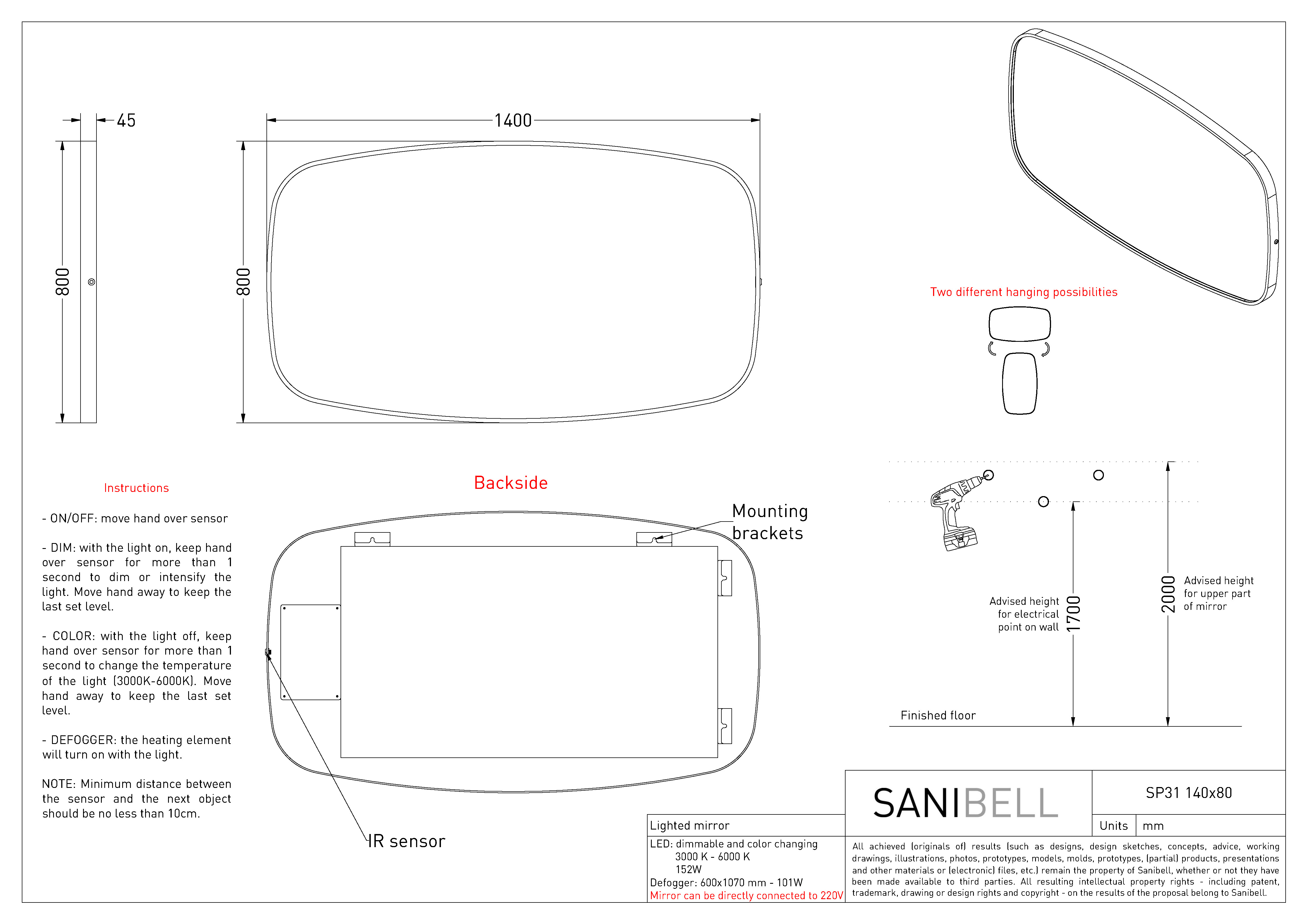 Sanibell Ink SP31 spejl m/lys, varme og sensor 140 x 80 cm - Mat hvid Superellipse-formet spejl fra Sanibell Ink med indbygget lys i rammen. Det eksklusive spejl har desuden indbygget memory funktion, så det husker forrige indstilling. Juster både lysets farve og styrke ved hjælp af den smarte touch-free sensorkontakt. Når du vælger dette spejl, kan du uden problemer bruge dit spejl, selv efter et langt, varmt bad, for spejlet har indbygget varme og er derfor dugfrit. Det rektangulære spejl kan vendes, og dermed monteres både lodret og vandret. Spejlet leveres i 6 flotte farver, så du kan fuldende indretningen på badeværelset med et spejl, der matcher både vandhane og badtilbehør. Specifikationer: