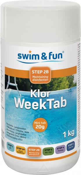 Swim & Fun Klor Week Tab 20 gr 1 kg OBS: Varen er på lager - både til afhentning og dag-til-dag levering. Klor WeekTab (langsomklor) tilsættes ugentligt for at vedligeholde rent poolvand