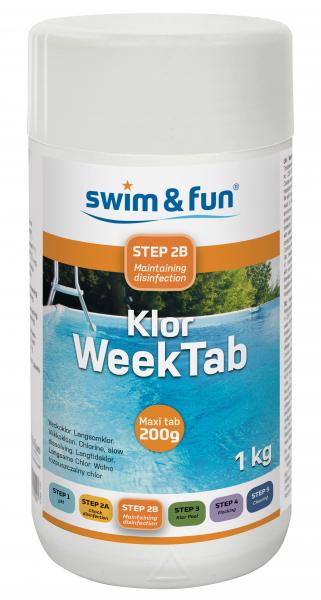 Swim & Fun Klor Week Tab 200 g 1kg Klor WeekTab (langsomklor) tilsættes ugentligt for at vedligeholde rent poolvand.