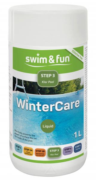 Swim & Fun WinterCare 1 L OBS: Varen er på lager - både til afhentning og dag-til-dag levering. Et kraftigt algeforebyggende middel til overvintring. WinterCare hæmmer belægninger i vinterhalvåret og forebygger kalkudfældning. Tilsættes poolen, når den lukkes ned efter sæsonen og igen ca. to uger før poolen genåbnes.