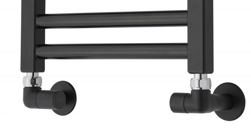 TVS ventilsæt type 150, vinkelløbende, vendbar - Sort Manuel ventilsæt type 150 er et vinkelventilsæt som bruges når man skal have sin håndklædetørrer monteret på central- / fjernvarmesystemet. Brugen af denne type ventil kræver at der afsat 2 indmuringsdåser i væggen med samme centerafstand som radiatoren. Man vil typisk bruge denne type ventil hvis man ønsker en løsning der ikke fylder meget og hvor der ikke skal reguleres på varmen jævnligt. Da reguleringen er manuel og ikke termostatstyret vil ventilen være meget følsom og der skal ikke skrues ret meget på ventilhovedet for at stille temperaturen. Ønsker men en ventil med termostat skal man vælge type 120, 121, 220 eller 221 i stedet for fra TVS Specifikationer: