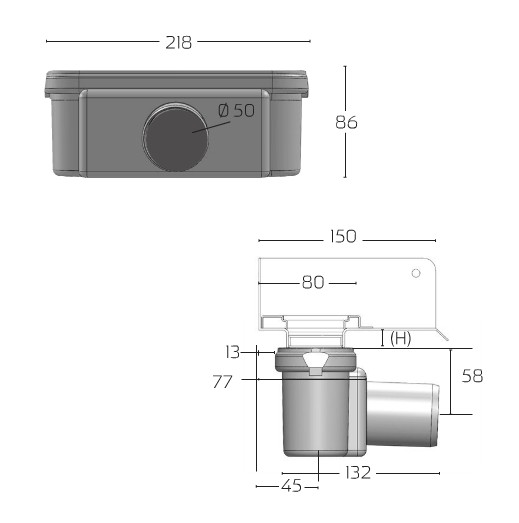 Unidrain udløbshus, linje, 50 mm vandret, med vandlås