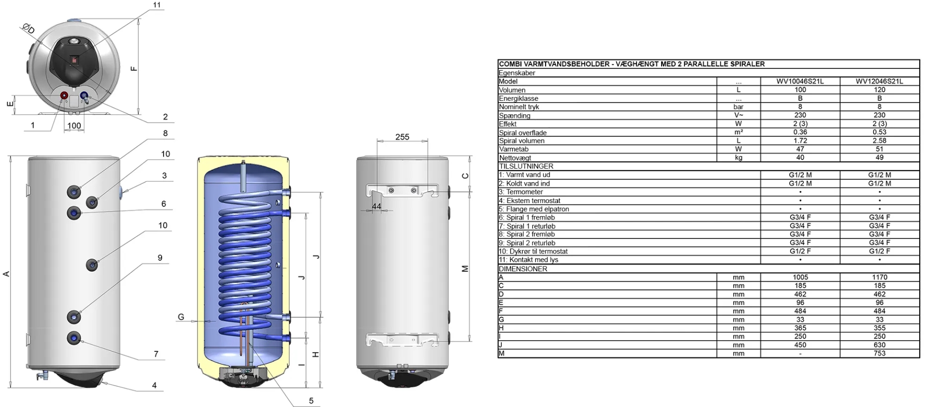 Eldom varmtvandsbeholder 100 L - Væghængt med 2 parallelle spiraler