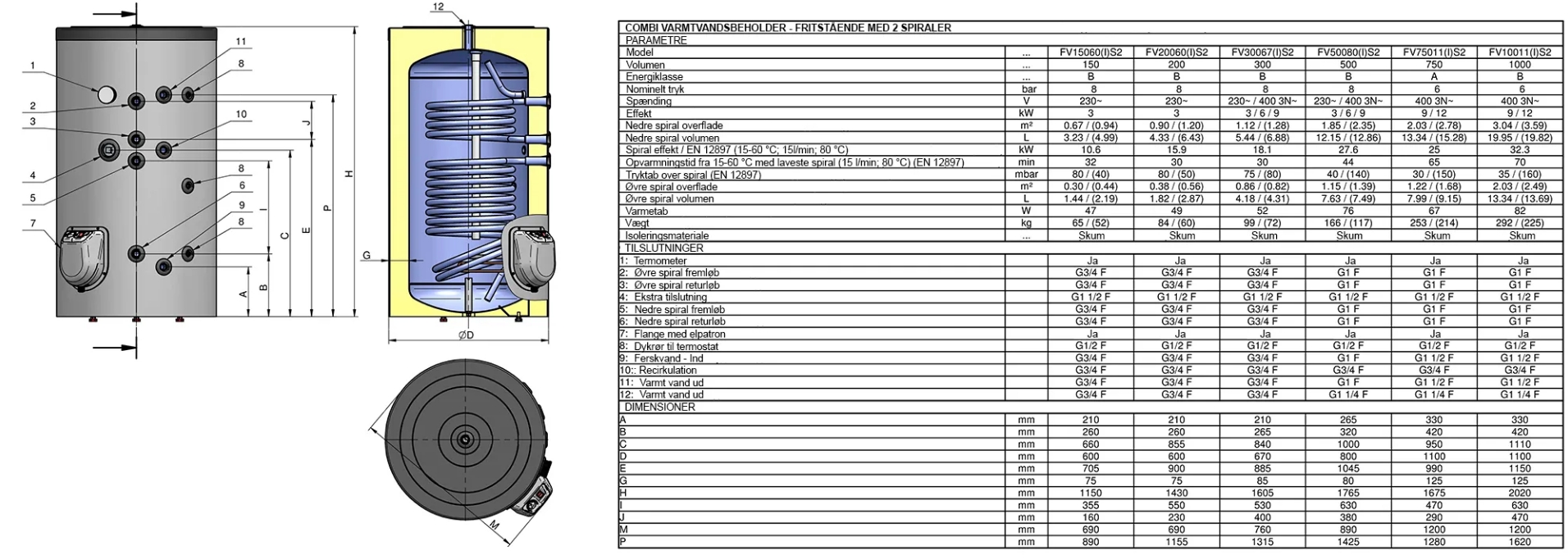 Varmtvandsbeholder - 150 L - Stor spiral - Til varmepumper