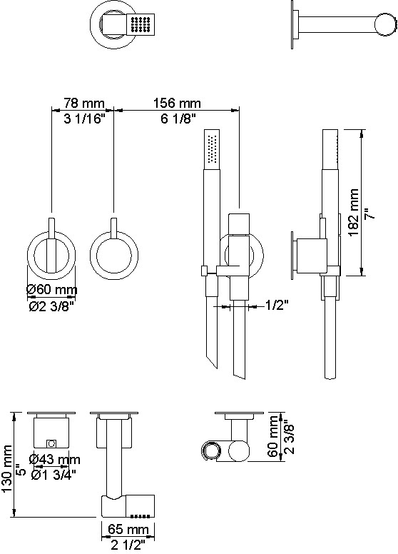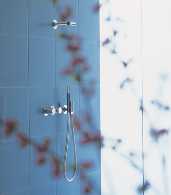 Vola Et-grebsblander for stor vandmængde med keramisk ventilenhed og omskifter samt løs afgangsmuffer. T2 Håndbruser med metalslange og holder Hovedbruser, 115 mm Rosetter Krom 16 ½''RG/PEX