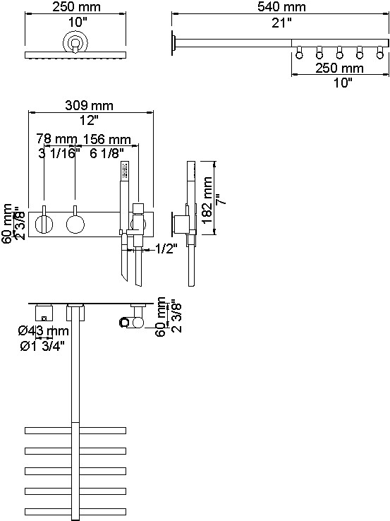 Vola Et-grebsblander for stor vandmængde med keramisk ventilenhed og omskifter samt løs afgangsmuffer. T2 Håndbruser med metalslange og holder Vægmonteret hovedbruser Dækplade Krom 16 ½''RG/PEX Billedet er uden dækplade |
