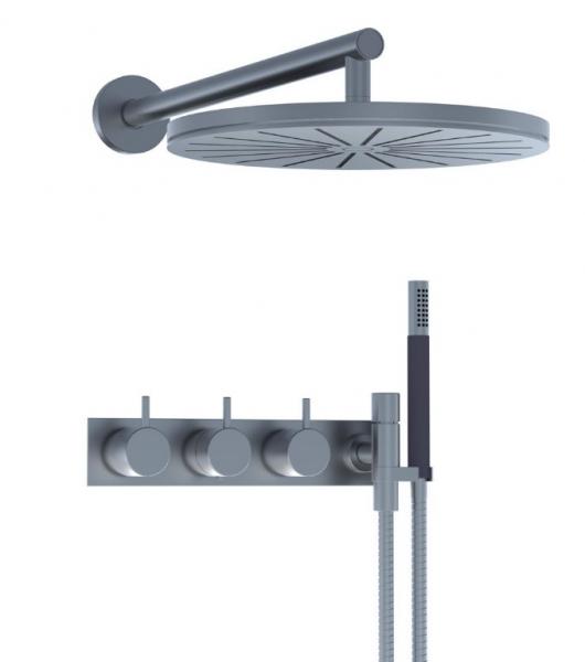 Vola 5474R-061 komplet brusesystem m/omskifter og bagplade - Krom Vola Indbygningstermostat ¾'' med omskifter T2 håndbruser med metalslange og holder til højre Hovedbruser, rund, vægmonteret Separat udløb Dækplade Krom 16 3/4''RG/PEX |