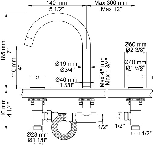 Vola To-grebsblander bestående af 2 stk keramiske stopventiler Svingbar udløb, udlæg 142 mm, ø19 mm Standard 25 mm Rosetter Krom 16 ½''RG |
