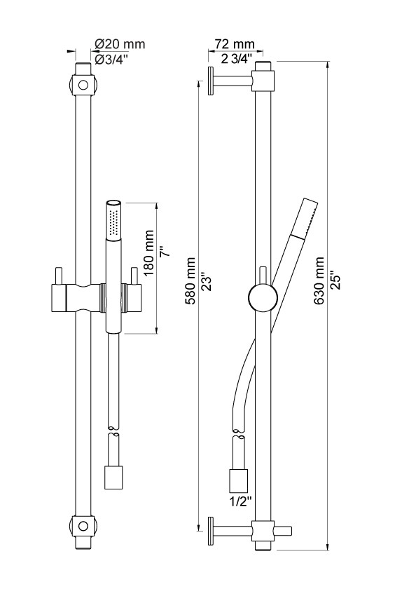 Vola T34 brusesæt. Bestående af brusestang, håndbruser og slange på 1,5 m. |