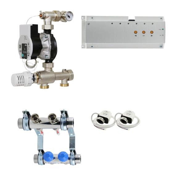 Watts Vision Trådløs gulvvarmesystem til to kredse Her har du et komplet gulvvarmesystem med de komponenter der skal bruges for en komplet ny gulvvarmeinstallation. Behovet for antal rumtermostater kan variere og derfor er de ikke med i pakken. Det kan være 2 kredse skal kobles sammen, så er der behov for én mindre rumtermostat end de antal telestater der er med i pakken. Vælg frit mellem 3 forskellige rumtermostater. Koblingssæt kan også variere fra installation til installation og derfor skal de også tilkøbes rette størrelse koblingssæt. Indeholder: